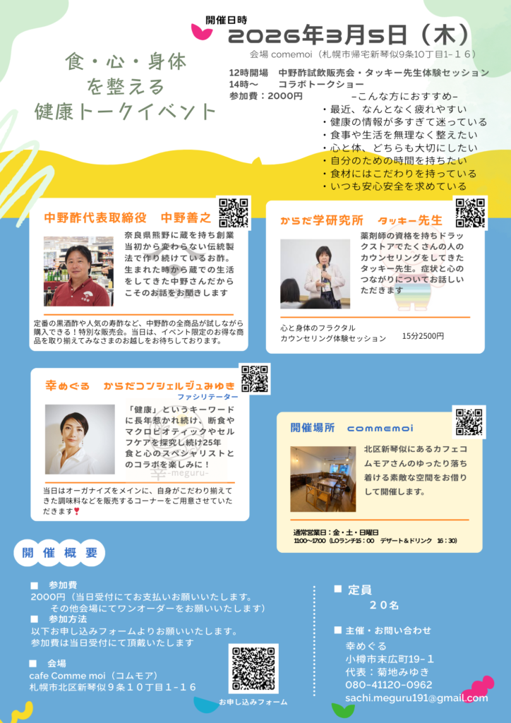 「食・心・身体」をテーマにした健康トークイベントに中野酢 代表取締役・中野善之が登壇します。