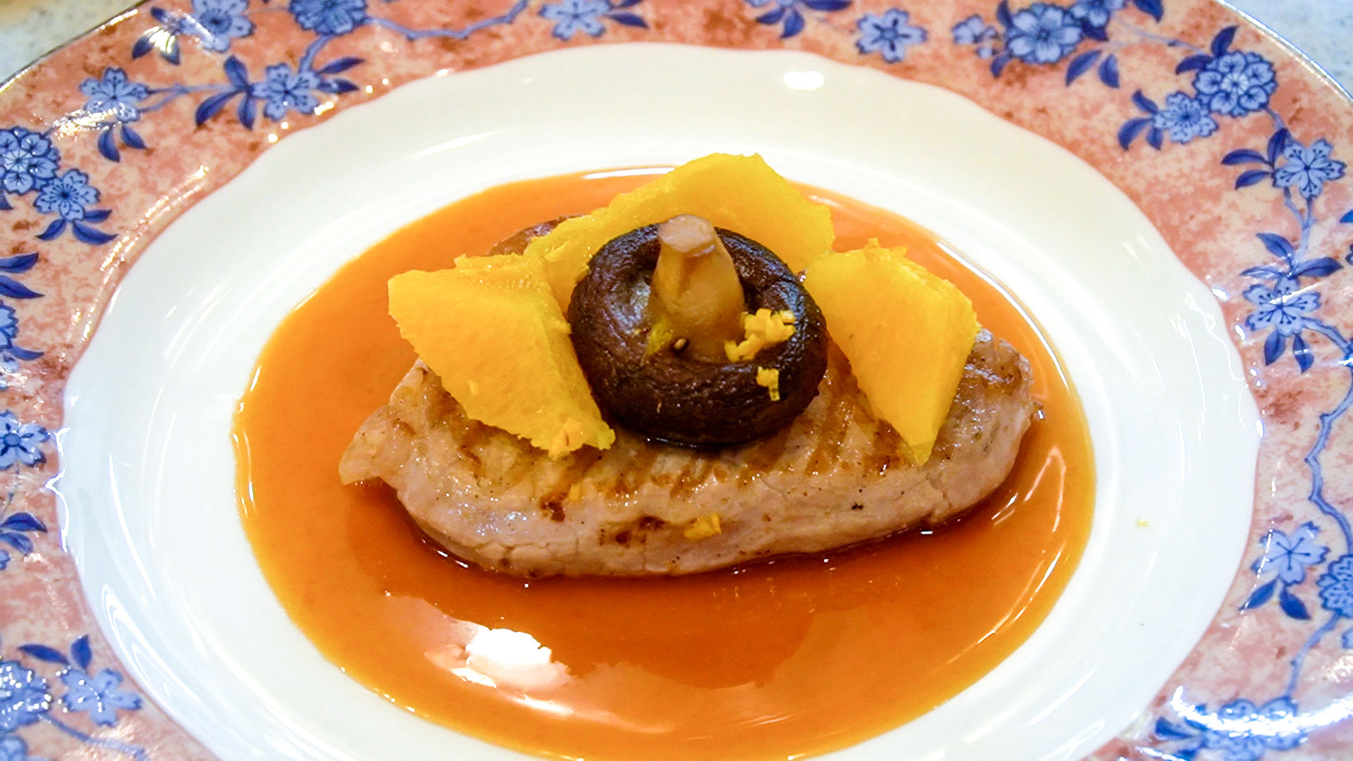 【デイズ養醸】豚ロースのロティ、オレンジと椎茸のブレゼ和え