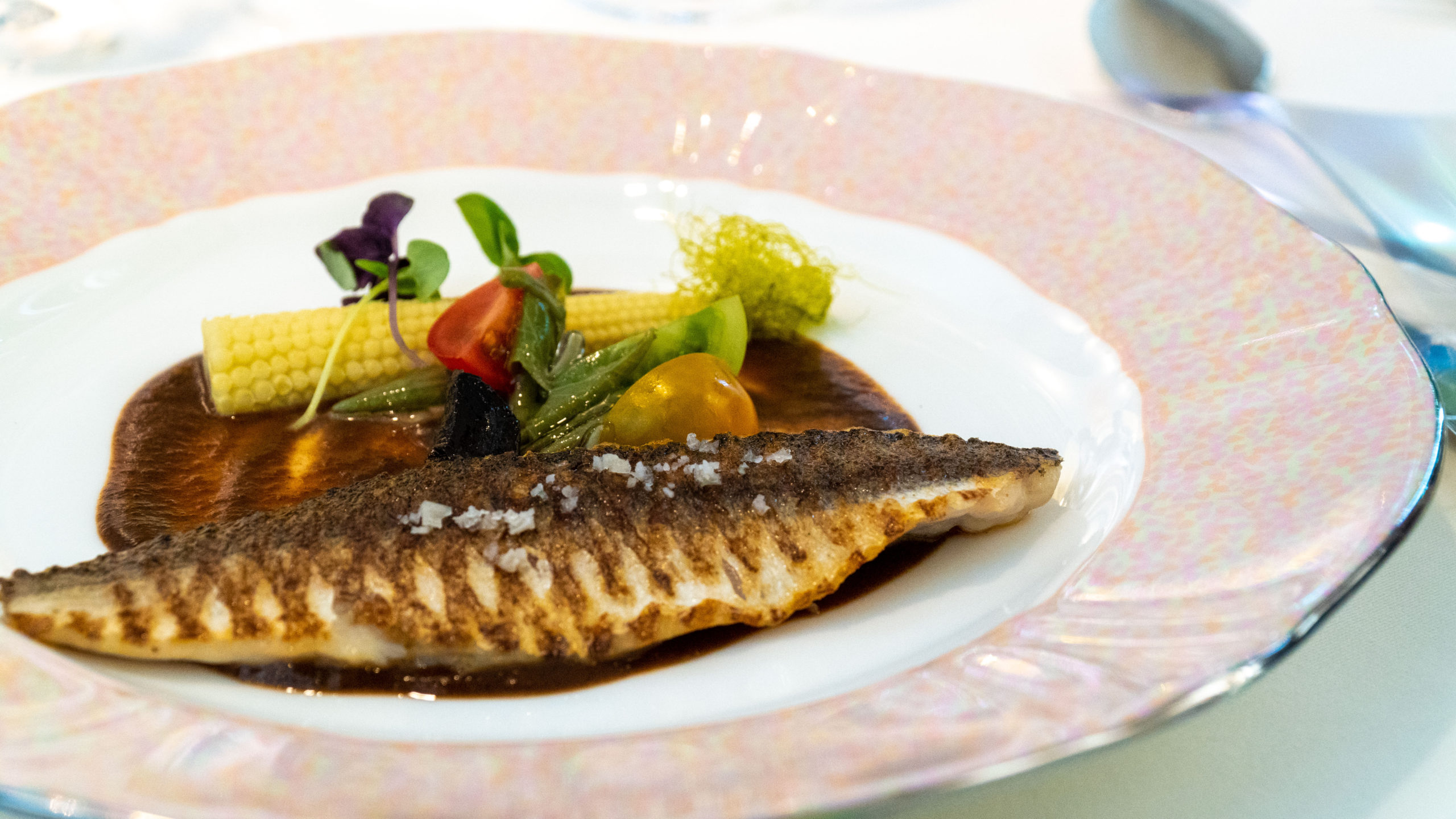 【萬年酢】カマスのグリル、黒ニンニクのピュレとオリーブ油味