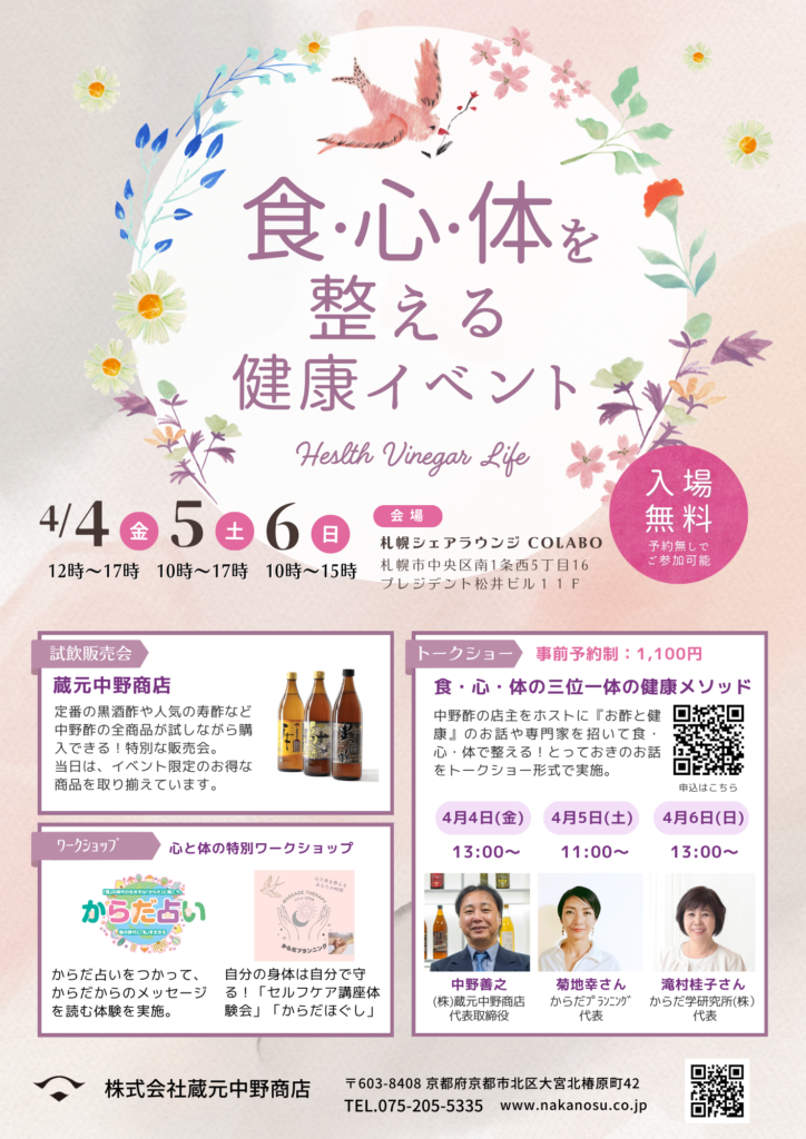 長年にわたり、昔ながらのお酢づくりを続けてきた『蔵元 中野商店』が主催する、“健康”をテーマにした特別イベントを北海道で開催します!