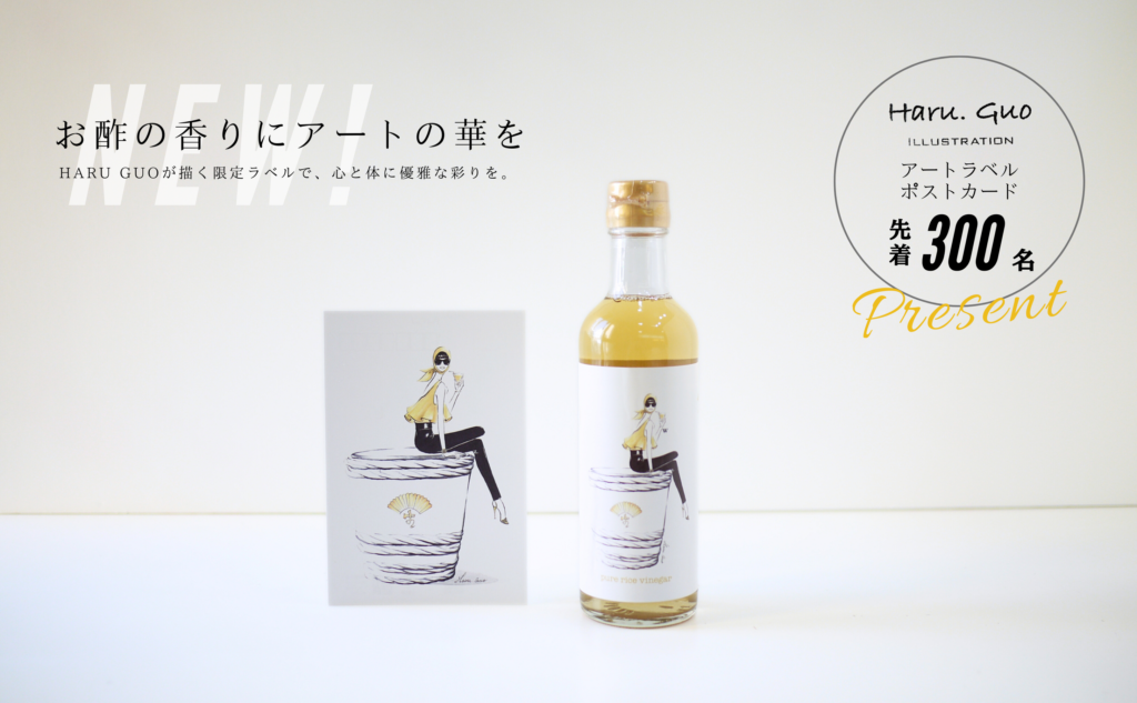 大人気をいただいているアートラベルシリーズ。デザイナー兼アーティストのHARU GUOさんが特別に手掛けたラベルデザイン。第2弾として数量限定「純米酢」を発売いたします。